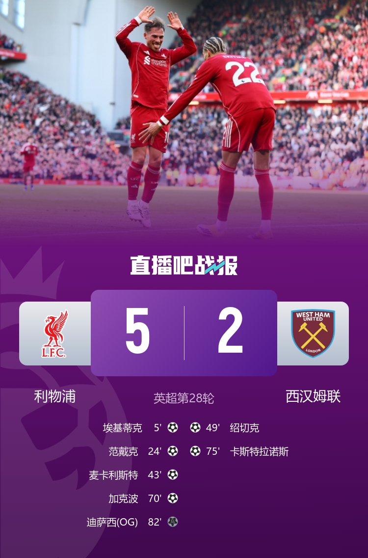 4连胜!利物浦5-2西汉姆暂升第5 红军3次角球得分埃基蒂克1射2传