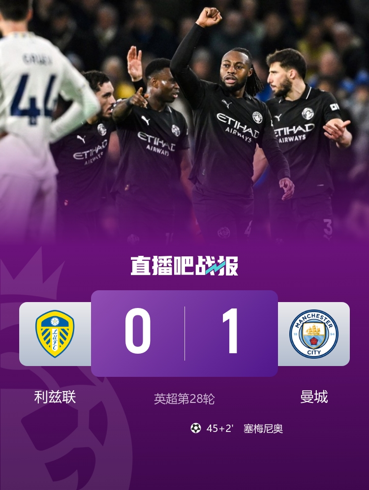 距榜首2分!曼城1-0利兹联联赛4连胜 塞梅尼奥制胜勒温失单刀