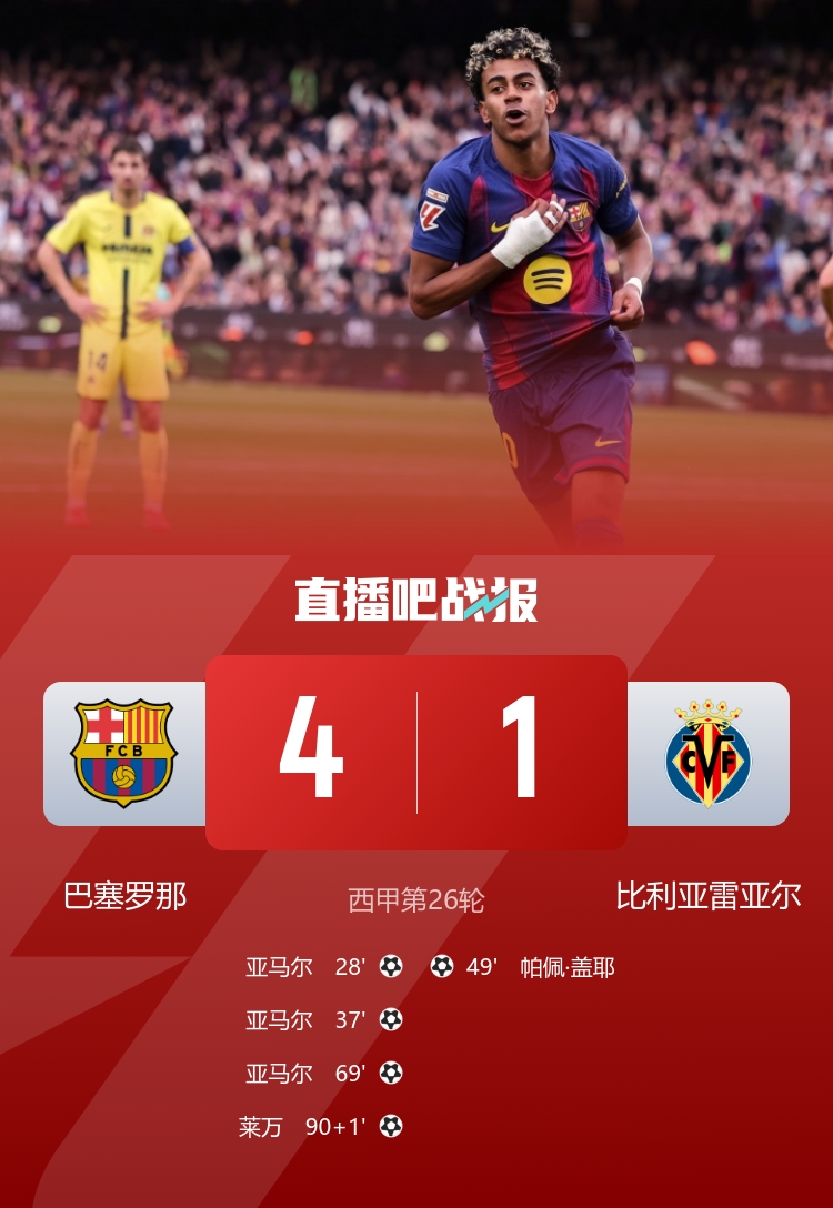 巴萨4-1比利亚雷亚尔先赛4分领跑。亚马尔斩获生涯首帽!莱万补时破门。