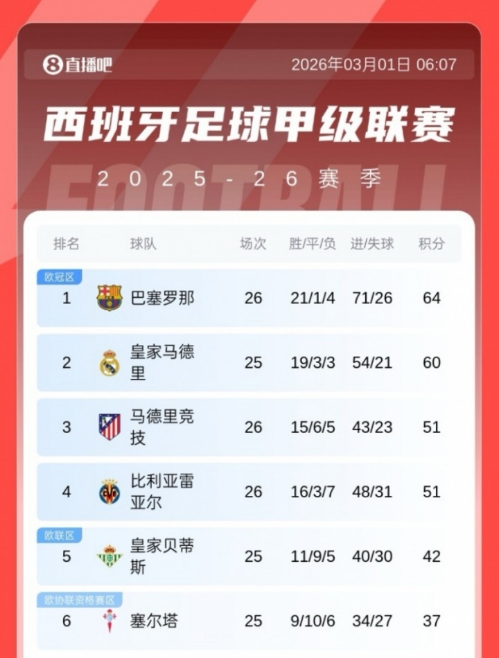 巴萨4-1战胜比利亚雷亚尔,马竞1-0绝杀皇家奥维耶多。积分榜方面,巴萨暂4分优势领跑。