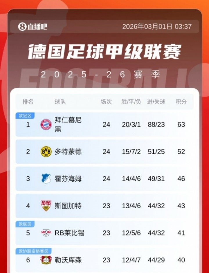 夺冠更稳了!德甲积分榜:拜仁扩大优势11分领跑,多特2轮不胜第2